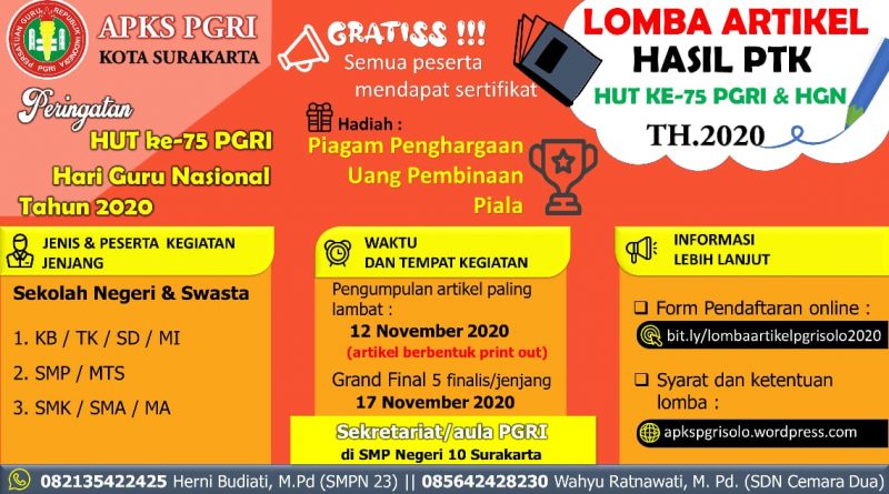 Read MoreDalam rangka memperingati HUT ke-75 PGRI dan HGN th.2020, kali ini APKS PGRI kota Surakarta mengadakan lomba artikel hasil PTK.